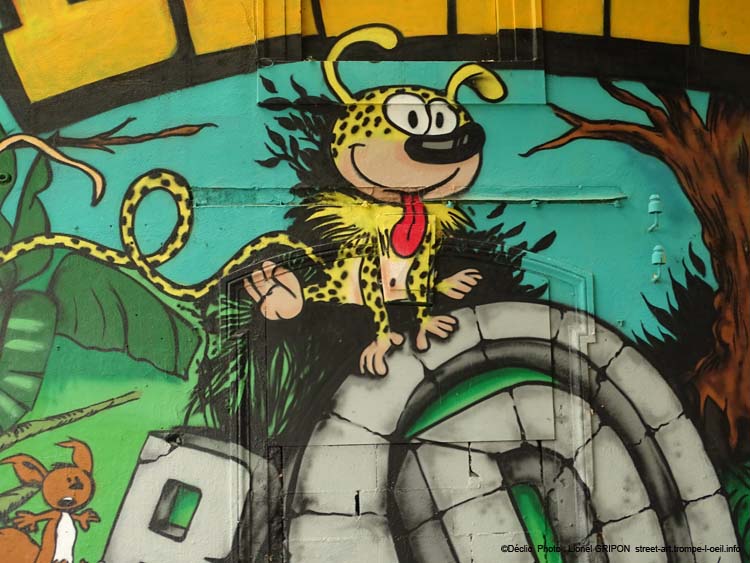 Avec cette fresque il nous plonge dans l’univers de bande dessinée de Spirou et Fantasio, et petit bonus on peut également voir Gaston La gaffe sur la partie droite. Il s’agit des personnages des différentes bandes dessinées du dessinateur belge Franquin (1924 – 1997).
