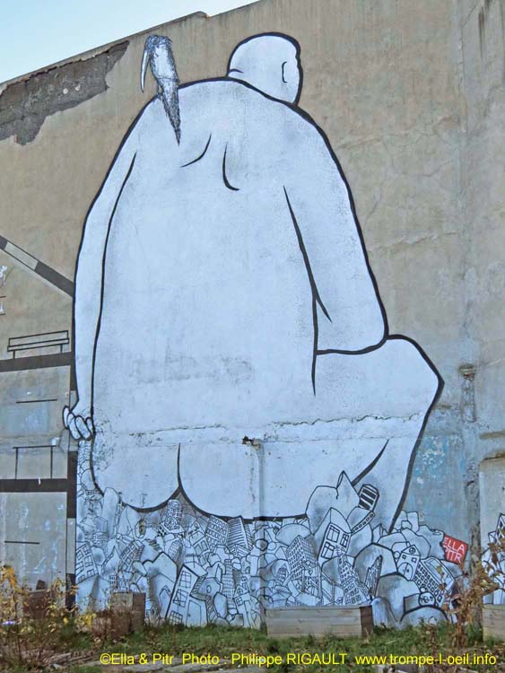 Quant à la symbolique du dessin, je ne vois vraiment pas sa signification : l'immeuble en coupe était demandé par l'organisateur; le géant est récurrent dans les œuvres d'Ella & Pitr; mais pourquoi nu ? Pourquoi un oiseau incongru sur l'épaule du géant ? Pourquoi l'asseoir sur un monceau d'immeubles renversés ? Mystères insondables des intentions des auteurs !
