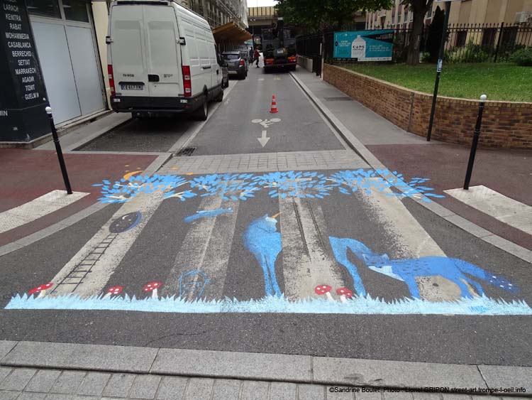 Elle a métamorphosé ce passage piéton en transformant les bandes blanches en tronc d’arbres, belle réussite. Elle nous plonge dans une forêt avec une licorne, un renard, et un écureuil (clichés Juillet 2023).