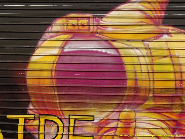 Sur le rideau de fer du théâtre Apollo il a forcément peint une réalisation en relation avec l’endroit avec un cosmonaute en lévitation dans l’espace (clichés Sept 2023).