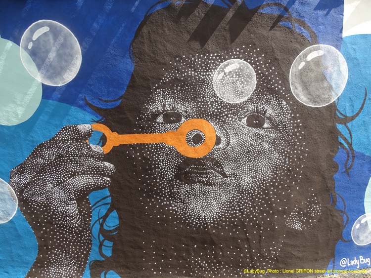 Dans son style reconnaissable, dans cette ruelle étroite, elle nous propose le portrait d’un enfant faisant des bulles de savon, cela doit rappeler des souvenirs à de très nombreuses personnes (clichés Juillet 2023).