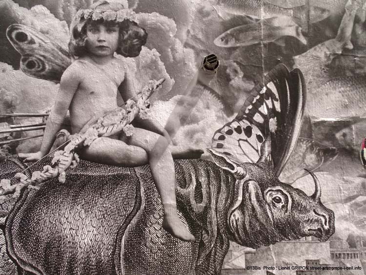 La palette du Treize bis est constituée d'images récupérées du 19ème siècle, des gravures pour l'essentiel. Les compositions réalisées appellent à l'onirisme et au surréalisme.
