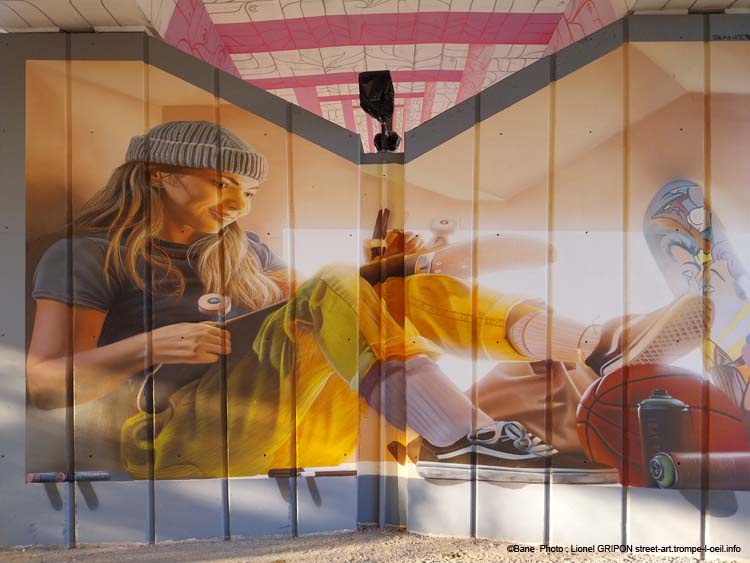 Il nous propose une réalisation originale avec cette jeune fille assise à l’intérieur du pilier grâce à un effet en trompe l’œil. La lumière vient éclairer la scène en provenant de la fausse trouée. Il a déjà anticipé la métamorphose programmée du lieu puisque cette jeune fille a un skateboard et un ballon de basket, le site va être prochainement organisé en un lieu de sport pour les jeunes de la ville (clichés Janvier 2025)