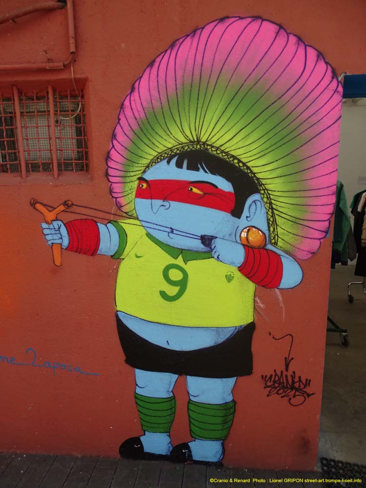 - Cranio , un artiste autodidacte… "J’ai commencé à dessiner dès l’âge de 2 ans. Mon côté un peu cérébral m’a valu ce surnom Cranio – crâne en Français. Passionné par les bandes dessinées et la représentation du quotidien, j’ai appris à dessiner dans la rue. Dès 14 ans, en 1998, je réalisais des fresques dans les rues de Sao Paulo." Cranio commence d’abord par le graff puis réalise des fresques de plus en plus grandes inspirées des cultures tribales amazoniennes.