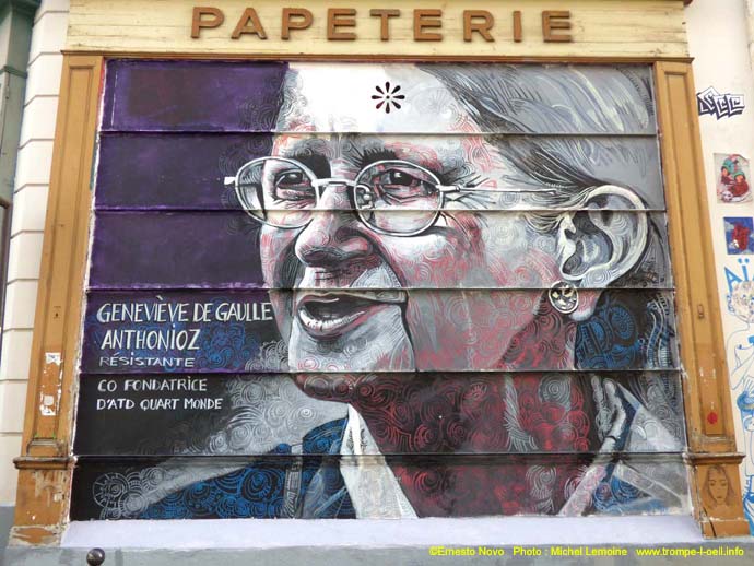 Geneviève de Gaulle-Anthonioz (1920-2002) était la nièce du Général. Elle s’engage elle aussi dans le groupe de résistance du « Musée de l’Homme » en juin 1940, et est arrêtée en juillet 1943. Emprisonnée à Fresnes, elle est déportée à Ravensburg en février 1944. Elle est préservée par Himmler qui compte l’utiliser comme monnaie d’échange, mais elle ne sera libérée que le 25 avril 1945 par l’entrée de l’Armée Rouge dans le camp. Après-guerre elle s’engage dans la lutte contre la pauvreté. Elle est présidente de la branche française d’ATD Quart Monde de 1964 à 1998, et se bat pendant dix ans pour une loi d’orientation contre la grande pauvreté qui sera finalement votée en 1998.