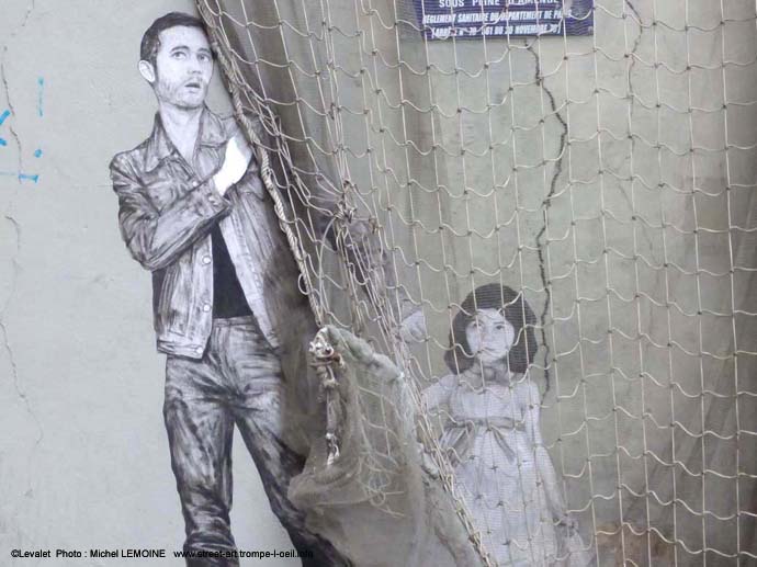 Ici, un gros filet de protection protège le petit mur qui pourrait bien tomber sur les passants sans cela. La mise en scène respecte au mieux cette curieuse configuration : l’homme écarte de sa main le rideau afin de laisser sortir sa petite fille. Lumineux ! (Texte : Michel LEMOINE - clichés pris en septembre 2015).