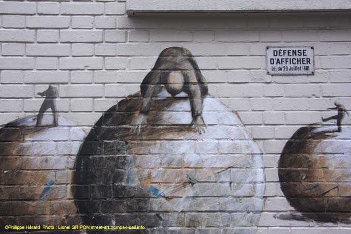Ses petits bonshommes ont bien du souci avec l’existence. Ils sont souvent confrontés à d’énormes boules qui les écrasent, où bien s’agrippent frénétiquement à des bouées de sauvetage. Ici ils essayent de tenir debout sur d’énormes sphères et ils ont bien du mal (clichés Janvier 2016).