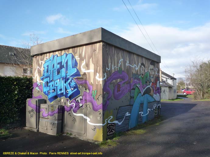 Mathias Orhan alias "BREZE", aidé de deux jeunes artistes Chacall & Macon, a réhabilité ce vieux transformateur EDF en décembre 2011. Un partenariat entre le service de nettoyage de la Ville de Rennes et ERDF permet de financer l’embellissement de transformateurs de la ville. Ce transformateur n'est pas visible de la rue et se trouve derrière un autre transformateur peint par DENZZZ en octobre 2015 (Clichés du 06/03/2016)
