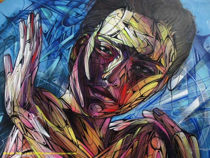 On reconnaît immédiatement une fresque d’Hopare (ou Alexandre Monteiro), son style est unique et le rendu est magnifique. L’artiste est né en région parisienne, il puise son inspiration dans l’architecture urbaine. Cela fera naître des murs au graphisme stylé et percutant. Son professeur d’arts plastiques s’appelait Shaka, qui fait également parti des 12 artistes de de cet évènement.
