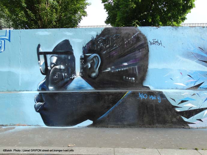 L’artiste Batsh nous livre une réalisation très originale, un homme noir de profil, et au milieu de la trouée de la tête on peut voir une rue bordée d’immeubles.