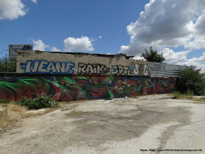 L’artiste Apaiz a réalisé deux fresques complètement différentes à moins de 50 mètres l’une de l’autre. Celle-ci est un ballet de couleur et de formes ondulées (clichés du 14/07/2016).