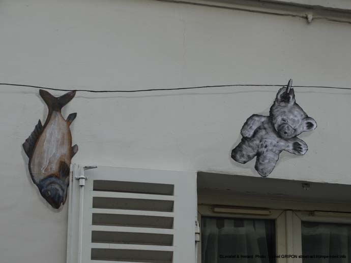 Dans la rue ils ont crée un fil conducteur, c’est le cas de le dire, un fil à linge tendu sur de très nombreux immeubles de la rue, où l’on peut voir différents éléments anachroniques attachés. Les habitants de la rue regrettent que cette œuvre soit temporaire (puisqu’il s’agit de collages) car cela a amené un vent de fraîcheur et de dynamisme dans leur quartier (clichés 23/10/2016).