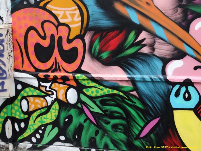 Trois artistes Bebarbarie & LalaSaïdko & Bailon pour réaliser une fresque à un endroit bien visible dans le quartier de « La butte aux cailles » qui regorge de street- art (Clichés 29/01/2017).