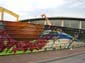 A l'occasion de l'extension du complexe sportif de Carrières sur Seine, des jeunes ont profité de la palissade, qui a été implantée pour empêcher l'accès à la zone de travaux, pour exprimer leur art graphique. Le sport, qui dis-je, les sports ont été mis en avant: du Football en passant par le Tennis et le Basket. Cette réalisation aurait pu également se trouver dans la rubrique des fresques AMOVIBLES, ou des fresques DISPARUES, mais du fait de son origine graphique elle se situe dans la rubrique des Graffitis (cliché du 22/06/2006).
