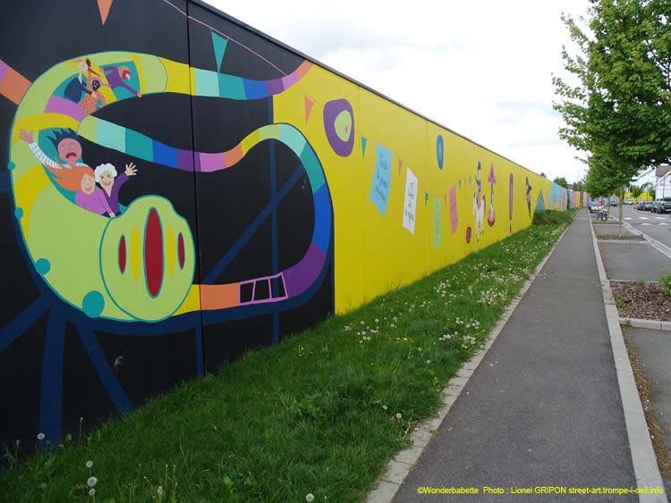 Elisabeth Réziciner alias Wonderbabette est une artiste strasbourgeoise. Elle a répondu à un appel d’offre de la commune de Hœnheim (commune nord de l’agglomération de Strasbourg) pour peindre ce long mur de 250 mètres de long, qui protège les élèves de l’école du bruit des trains qui passent. Elle a encadré 150 élèves qui ont contribué à la réalisation de la moitié de la fresque soit 125 mètres linéaire. Le choix du thème s’est porté sur le patrimoine historique et urbain de la ville. Le corbeau fait référence au blason de la ville, la locomotive rappelle les ateliers SNCF voisins, les images du manège et du bal populaire font écho à la fête populaire de la commune. Les oiseaux, les fleurs, le plan d’eau sont une allusion à l’écoquartier « L’île aux jardins » de la commune. Ces dessins sont complétés par des citations de poètes (clichés Avril 2019).