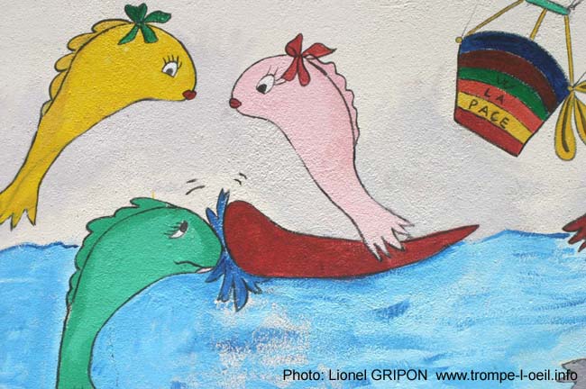 D'un coté du mur : Des poissons, des dizaines de poissons de toutes les couleurs gouttant aux plaisirs de vacances aux bords de la mer : Vous trouverez donc : le poisson tennisman, le poisson serveuse, celui qui ne sait pas nager et qui a besoin d'une bouée, le poisson peintre, les poissons orchestre, les poissons joueurs, le tout entouré de superbes « poissonnettes » arborant de magnifiques noeuds sur leur nageoire dorsale. Superbe, j'adore, génial. Sur l'autre angle du mur, ce sont de superbes fleurs qui vous accueillent.
