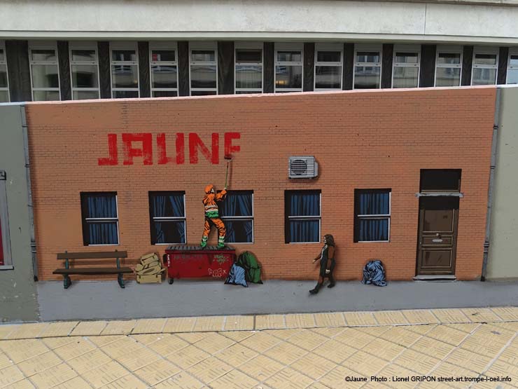 Jaune est un artiste pochoiriste bruxellois qui met majoritairement en scène des agents de propreté.