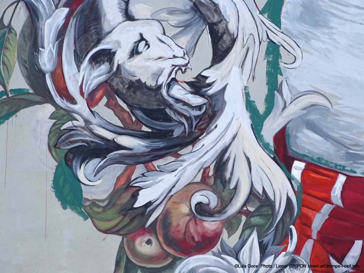 Elle nous propose une belle femme aux cheveux longs qui se verse du thé. Par contre le contenu de la théière est très surréaliste, puisqu’on peut y voir deux têtes de chèvres, des fruits et des végétaux (clichés Juillet 2019).