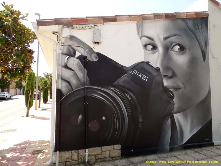 J’ai pris cette fresque par hasard, en empruntant la rue qui traverse le village. Il s’agit d’une réalisation publicitaire qui orne le studio photographie Pixel. Il a donc peint une fresque afin de mettre en avant ce studio, une jeune femme tenant un appareil photo dans ses mains (clichés Juillet 2022).