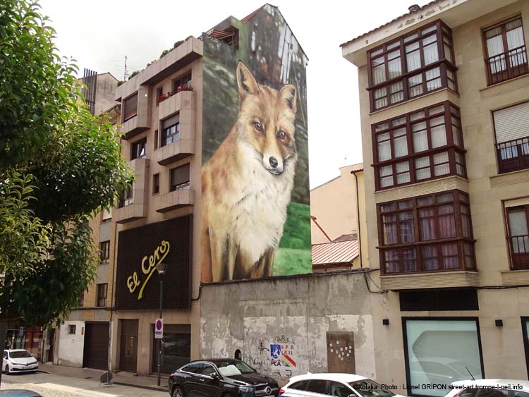 Dans le dialecte asturien « La raposa » signifie le renard. Ici il fait 23 mètres de hauteur et cette fresque est l’une de ses plus grandes. Il a le regard très perçant et il regarde fixement les enfants du parc situé juste à coté (clichés Juillet 2023).