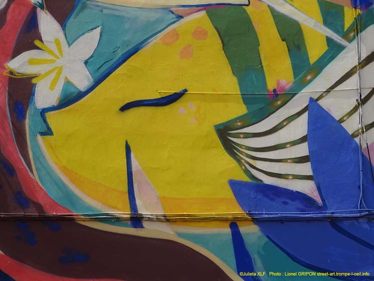 Cette grande fresque, sur ce petit mur pignon, véhicule un message écologique. Elle précise : « Ce mur fait partie d’une série que je peins pour parler du danger d’extinction des anguilles européennes » (clichés Juillet 2024).