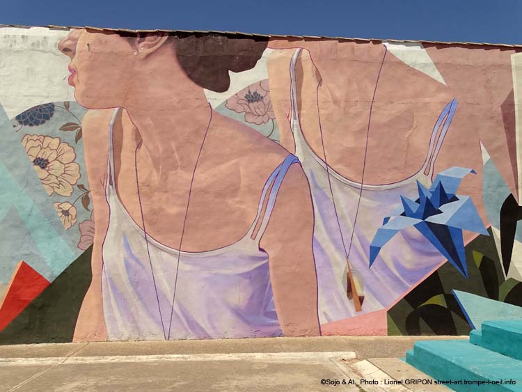 Ils ont intitulé cette fresque « créativité », ou l’on peut voir une femme la tête tournée vers l’extérieur. Elle est accompagnée de formes géométriques et de fleurs (clichés Juillet 2024).