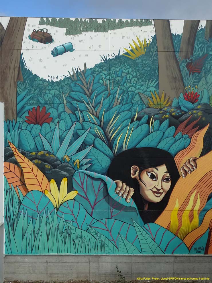 Iria Fafián nous propose une belle fresque où le vert domine, car nous nous situons dans une sorte de jungle. Un femme a délaissé son sac et son tapis de couchage pour se frayer un chemin au milieu des plantes (clichés Juillet /2019).