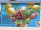 Cette réalisation, très colorée et vive, attire l’œil. Les légumes et fruits (pomme, poire, poivron et échalote) ressortent particulièrement bien sur le fond bleu. La poule est magnifique et son œil vous glace un peu le sang. Coté face, deux couleurs uniquement, ce qui tranche, il s’agit d’ail peint en blanc sur fond bleu (clichés du 29/07/2012).