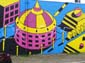 Cette longue fresque arbore une ville futuriste dont l’artiste a le secret. Il l’a parsemé de trois mots en 3 dimensions : Clowns, animals et freaks ou clowns, animaux et monstres (clichés du 02/05/2019).